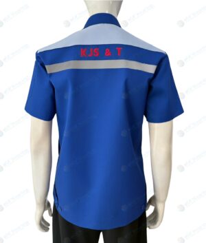 เสื้อช็อป แขนสั้น สีน้ำเงินบ่าสีฟ้า กระเป๋าสองข้าง ปักอกซ้าย [02]