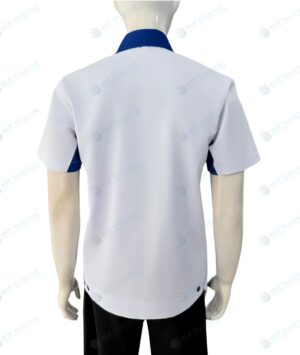 เสื้อช็อป แขนสั้น สีขาว ตัดแถบขอบข้างสีน้ำเงิน คาดเทปสะท้อนแสงหน้าหลัง ปักอกขวา [03]