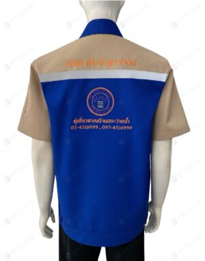ตัวอย่าง เสื้อช็อป แขนสั้น-3 ตัดต่อ สีน้ำเงิน-เบจ คาดเทปสะท้อนแสงหลัง ติดกระเป๋า ปักอกซ้าย แขนติดกระเป๋าปากกา