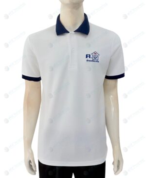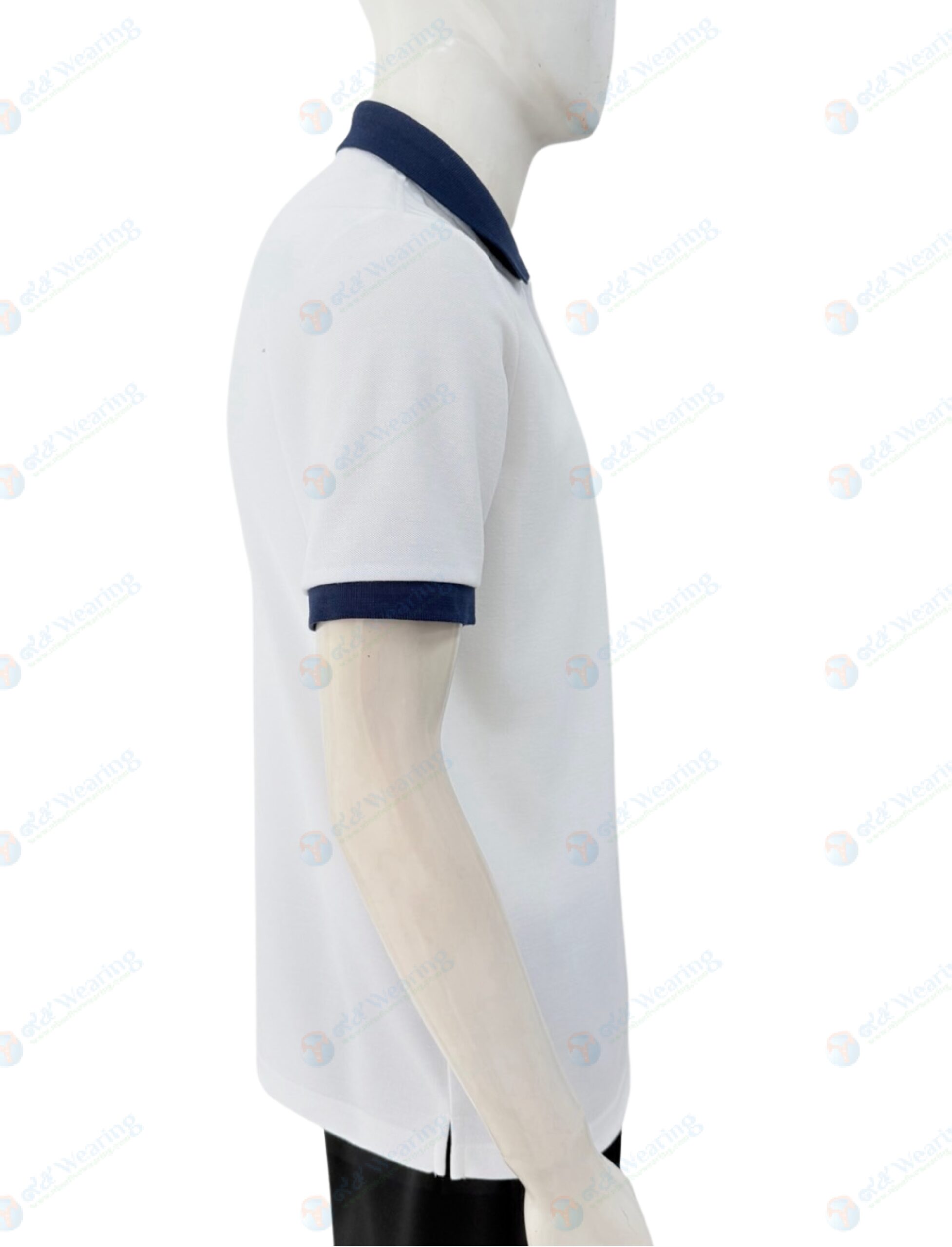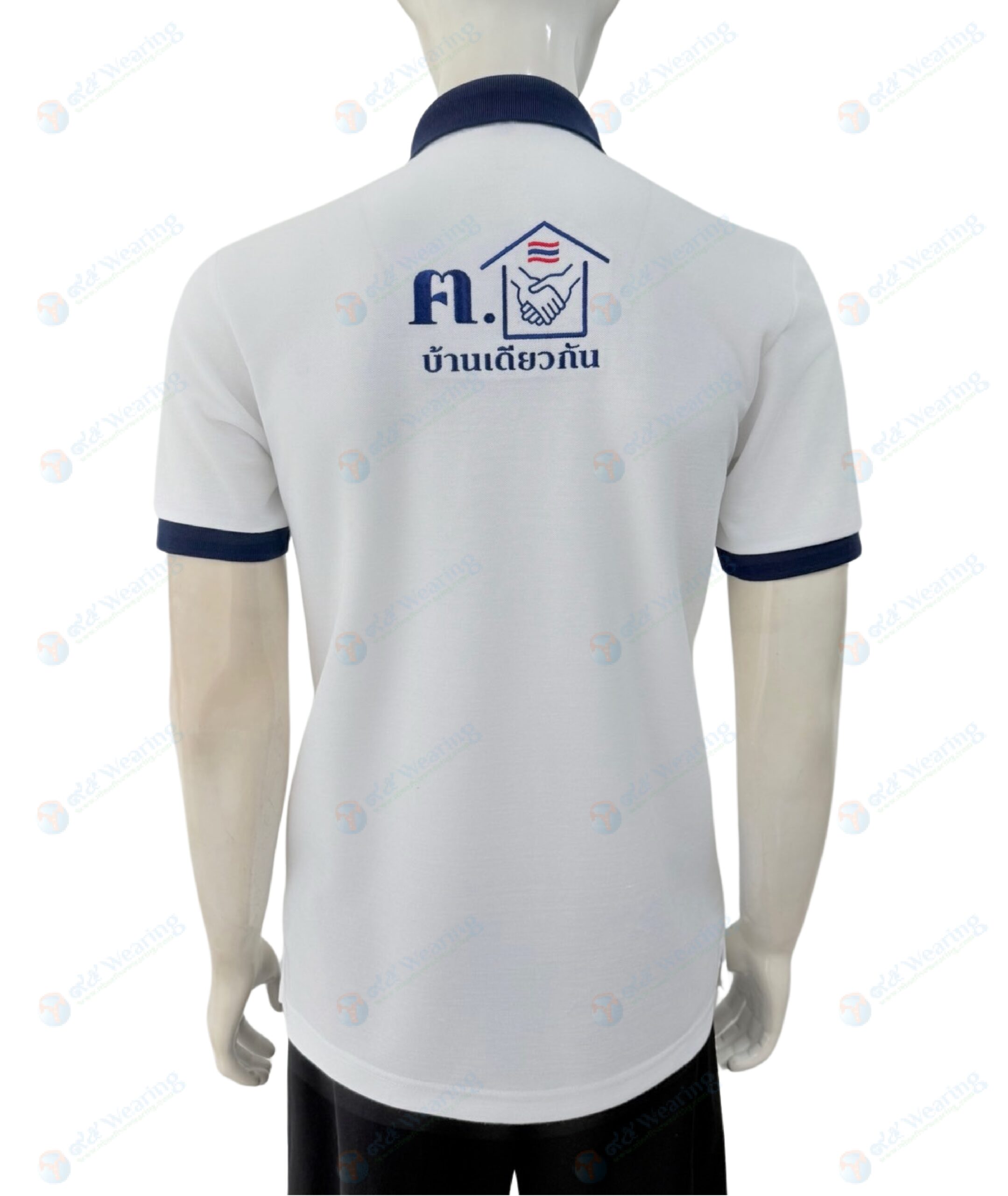 เสื้อโปโล สีขาว คอปกและขอบแขนสีดำ แขนจั๊ม ปักอกซ้ายและหลัง [29]